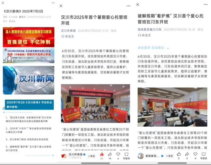汈东街道“爱心托管班”受到了各方关注,孝感团市委对其进行了宣传报道,汉川新闻、云上汉川、汉川共青团对信息工程学院团队和活动进行了专题报道,社会反响热烈,社会效应良好。家长们纷纷在云上汉川,汉川共青团账号下为团队评论、点赞。