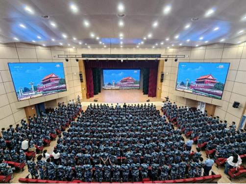 上午8时30分许,2024级全体参训学生身着迷彩服,在崇德礼堂内队列齐整就座。教官团队、副院长王越及各班辅导员老师分列观众席,将军训育人课堂延伸至国防教育现场。9时整,阅兵仪式正式启动,千余名师生起立奏唱国歌,气氛庄严热烈。