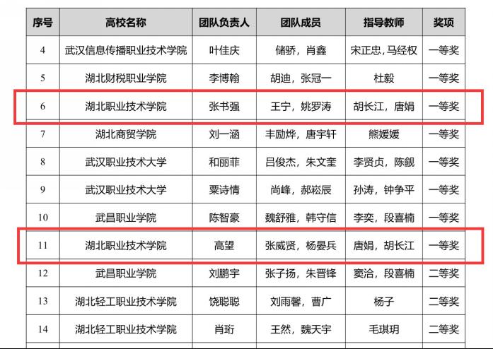 (通讯员:胡长江)6月21至22日,第四届湖北省大学生信创大赛(高职组)在武汉职业技术大学光谷东校区举行,信息工程学院唐娟、胡长江老师指导的张书强/王宁/姚罗涛、高望/张威贤/杨晏兵两支团队凭借扎实的专业知识和技能均荣获“新华三”人工智能及算力赛道一等奖。