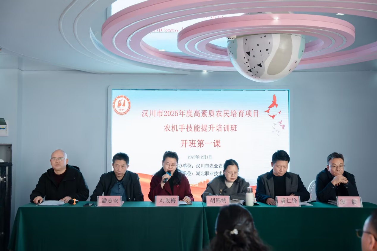 (本网讯 叶潘)12月1日上午,汉川市2025年度高素质农民培育项目农机手技能提升培训班在汉川开班。本次培训由汉川市农业农村局主办,信息工程学院承办。汉川市农业农村局二级主任科员胡锦绣、刘俊梅,农机技术推广中心主任聂仁锋,继续教育学院副院长汪向东,信息工程学院院长潘志安、党总支书记段毅、副院长吴春花等出席开班仪式。仪式由汪向东主持。