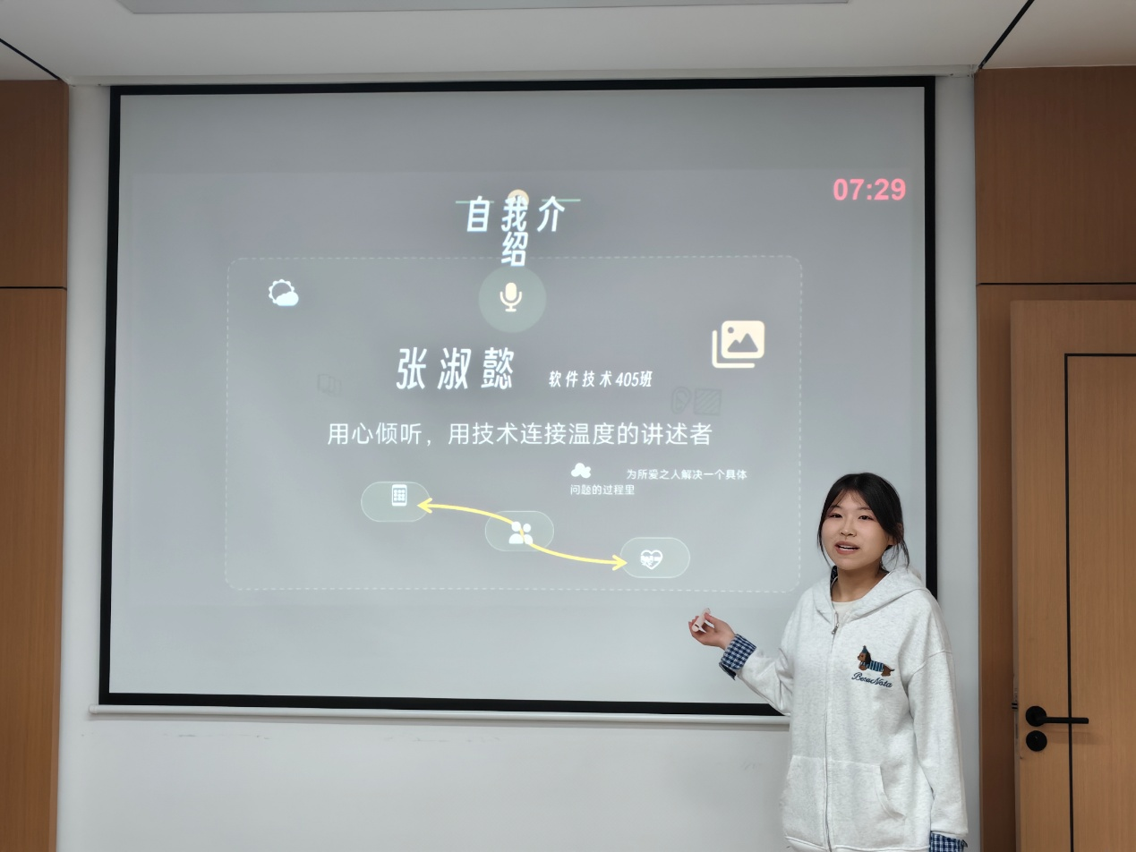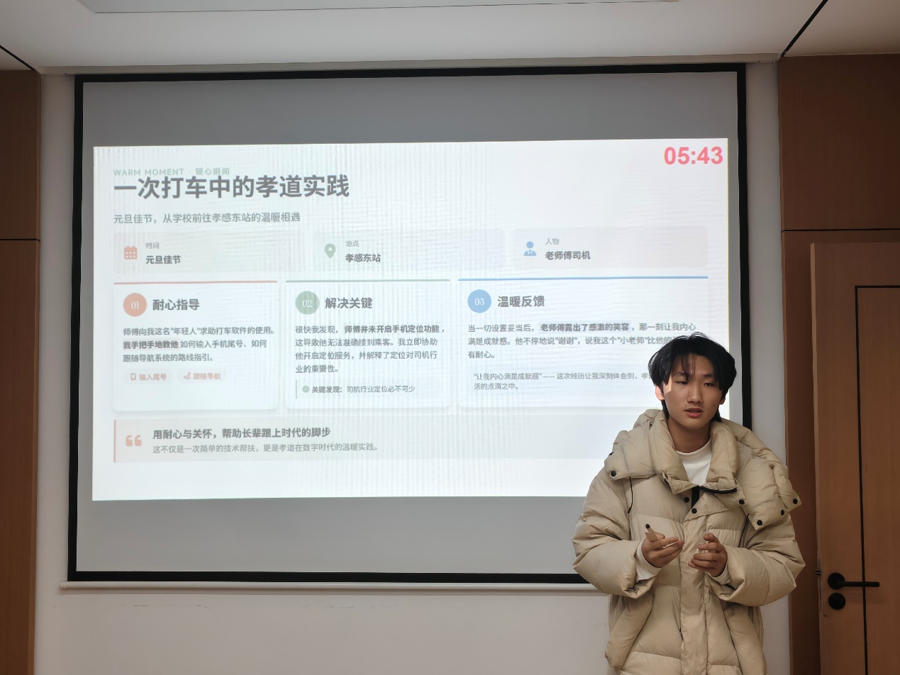 决赛现场气氛热烈,座无虚席。选手们立足专业所学与生活体悟,围绕“承孝于心,创信于行”“数字传孝”“码上寄孝心”等主题,或分享利用智能设备关怀长辈的温暖故事,或阐述如何用代码搭建承载家族情感的数字化档案。他们通过生动的个人事例与图文演示,将抽象的技术语言转化为真挚的温情叙事,深刻诠释了“技术赋能情感,创新延续传统”的丰富内涵,展现了扎实的思辨能力与深厚的人文素养。