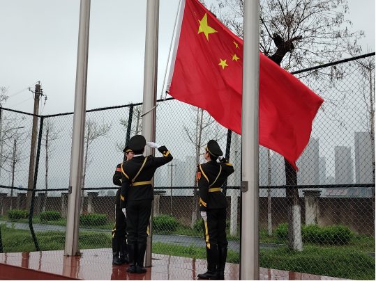 当雄壮的《义勇军进行曲》奏响,五星红旗冉冉升起、迎风舒展,全体师生肃立注目,齐声高唱国歌。嘹亮的歌声穿透细雨,既饱含对祖国的深情礼赞,也凝聚着对雷锋精神的崇高敬意,更激荡起“强国有我、奉献有我”的青春誓言。