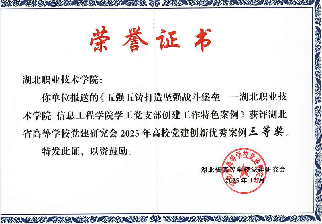 (通讯员:王越 李颖前)近日,湖北省高等学校党建研究会2025年高校党建创新优秀案例评选结果揭晓,学校报送的《五强五铸打造坚强战斗堡垒一一湖北职业技术学院信息工程学院学工党支部创建工作特色案例》党建工作案例荣获三等奖。